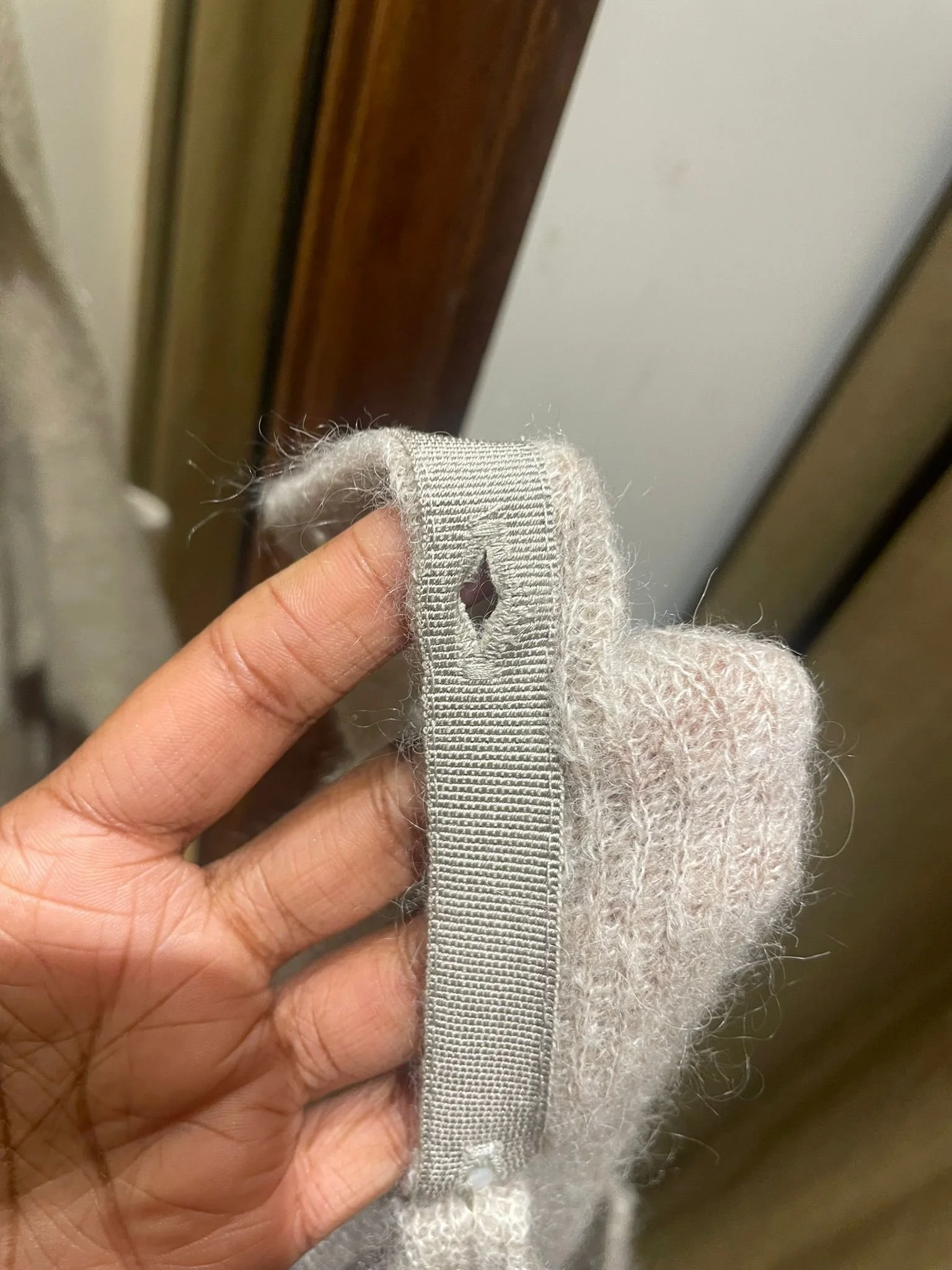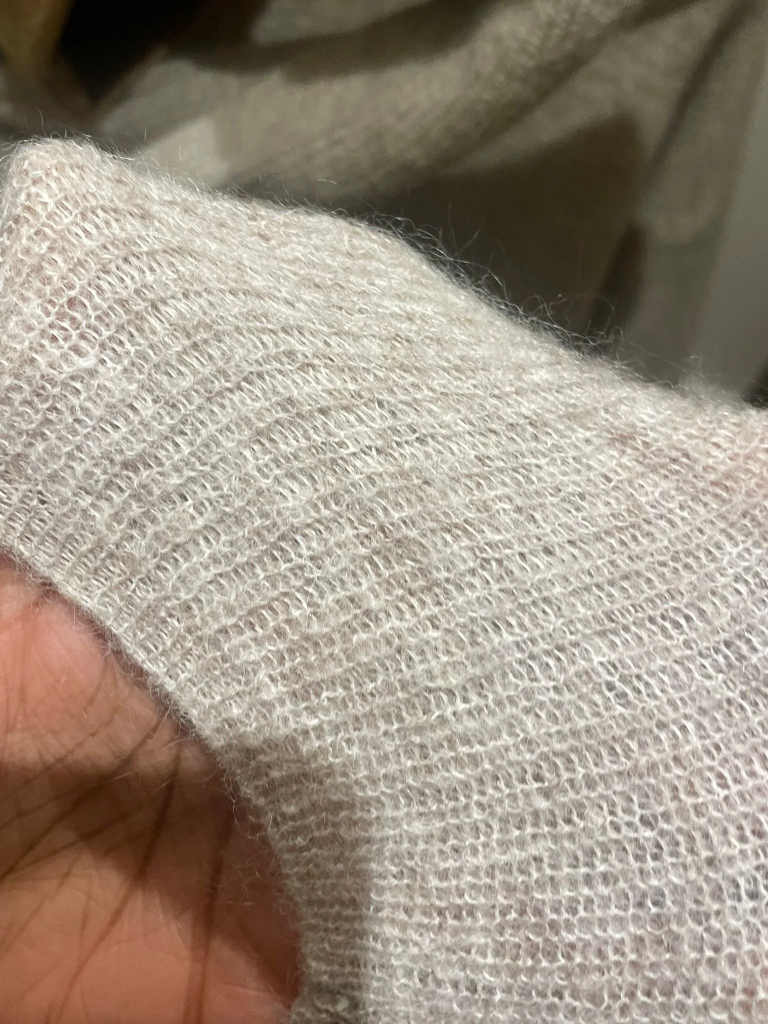 Ensuite, côté matière et tricot, le gilet Gaspard de Sézane est tricoté de manière assez lâche. On voit un peu à travers, mais ce n’est pas du tout un signe de mauvaise qualité, contrairement à ce qu’on entend souvent dans certaines vidéos Instagram. Avec un mélange contenant du mohair et de l’alpaga, comme sur le gilet Gaspard , on tricote justement plus ouvert pour profiter du côté très moelleux et duveteux de ces fibres.